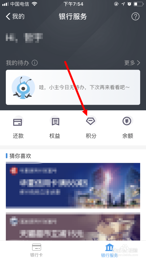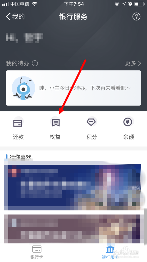 然后,进入 我的银行卡 页面,点击 银行办事 。