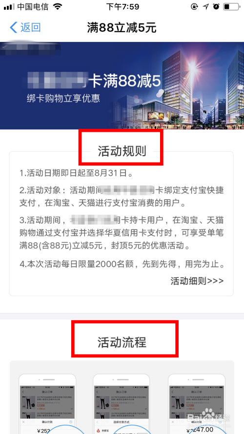 在 权益中间 ,可以看到 淘宝权益 和 休闲娱乐 。 淘宝权益 就是在淘宝或天猫购物后用某信用卡付出可以获得现金优惠的活动,休闲娱乐是指某银行卡的其他优惠活动。别的,我们还可以点击某个优惠活动,来看看该活动的具体内容。
