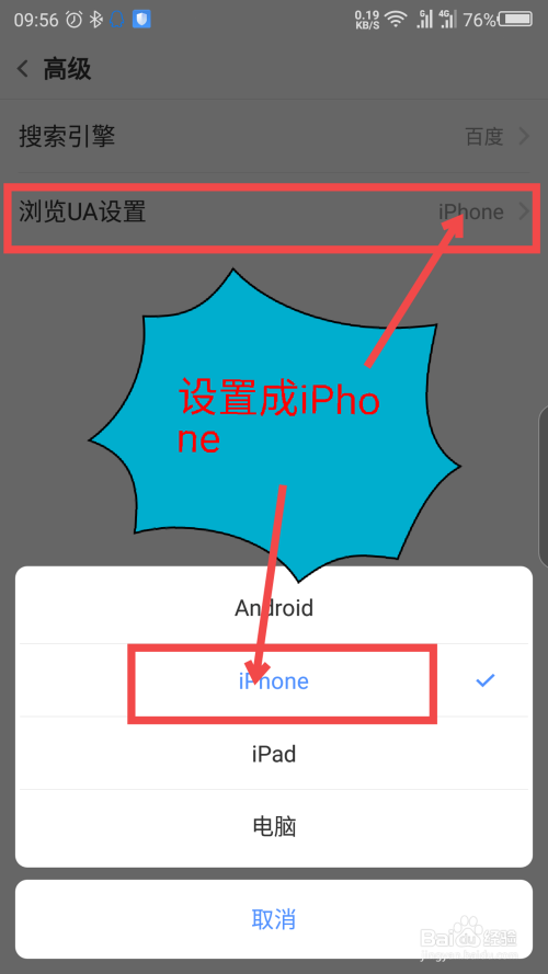 在浏览器的设置里面,把浏览器UA设置当作iPhone。操作如截图所示