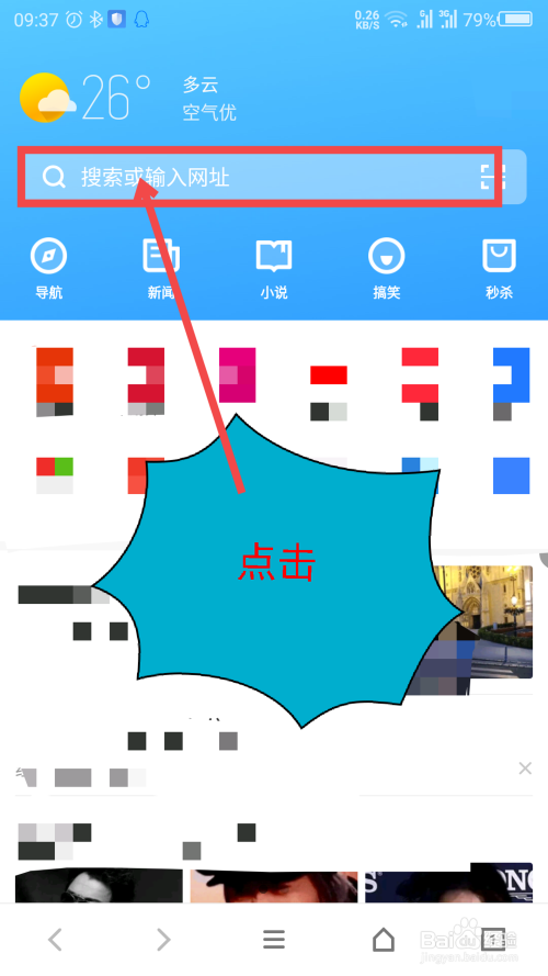 返回浏览器首页界面,点击浏览器顶端的搜索框。操作如截图所示