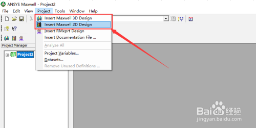 首先打开我们电脑上的ANSYS Maxwell软件。然后建立一个2D设计工程。如图所示。