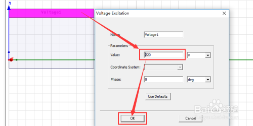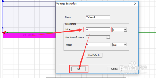 然后在Voltage Excitation界面里的Value栏中输入220。再点击ok。如许我们把rectangle2的电压设置为220V了。