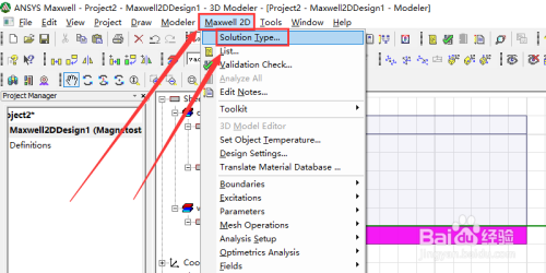 然后在菜单栏中的Maxwall 2D中点击solution type...。进入求解类型设置界面。如图所示。