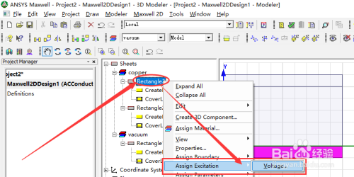 我们可以把rectangle2和rectangle3材料改为铜,参照下面链接即可点窜,也可以不改。然后我们用鼠标右击rectangle2,再点击Assign Excitation和Voltage。如图所示。