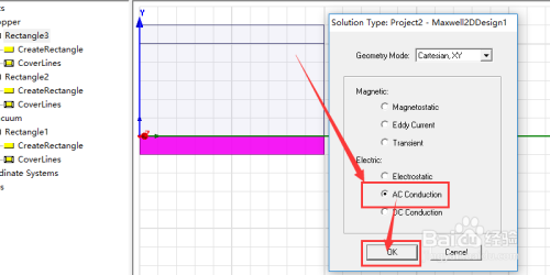然后在求解类型设置界面中,把电的类型选择AC conduction。然后点击ok。如图所示。