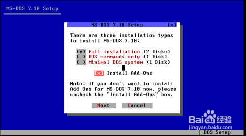 然后保留设置,再次进入MSDOS安装,然后一路回车,到了这里停一下:用小鼠标勾失落Install AddONs,然后继续一路回车,进入号令行后,敲个号令:shutdown r 重启,重启之后,按F2把HardDrive调到第一位,MSDOS安装完当作!!!