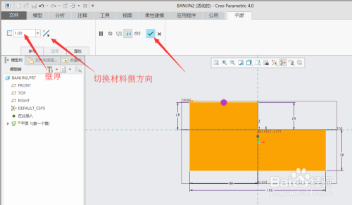 界说壁厚(好比:1),界说材料侧偏向,然后单击”平面“操控板中的“确定”按钮。