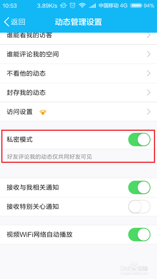 在隐私设置页面中,我们可以看到最后一个设置项目,点击对应的按钮开关即可开启QQ空间的私密模式。