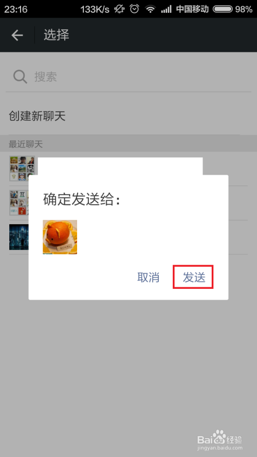 接下来,页面会弹出确认发送的信息提醒框,我们点击“发送”按钮,然后即可选择将这些图片发送给该微信老友。