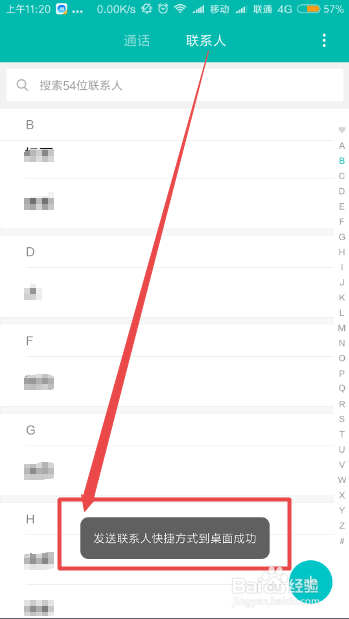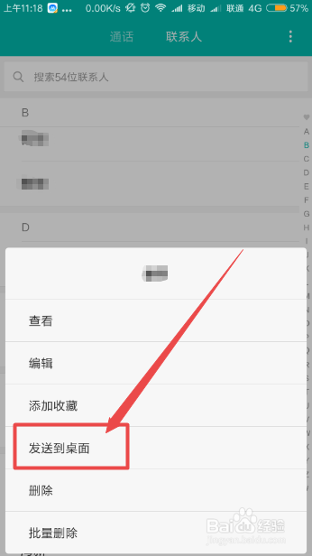 然后找到需要发送到桌面的联系人,长按住它,在呈现的菜单中点击发送到桌面选项。