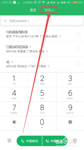 然后会来到拨号本家儿页面,点击当前页面上面的联系人选项。