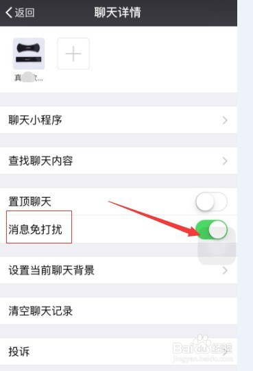 动静免打搅开启,显示绿色就暗示开启。开启后,他发的动静就不会有提醒。