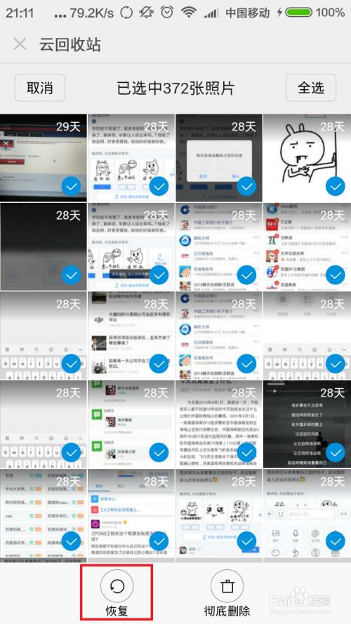 当然,若是你想删除此中的所有照片的话,我们点击页面右上角的“全选”按钮,然后点击页面右下角中的“删除”按钮。