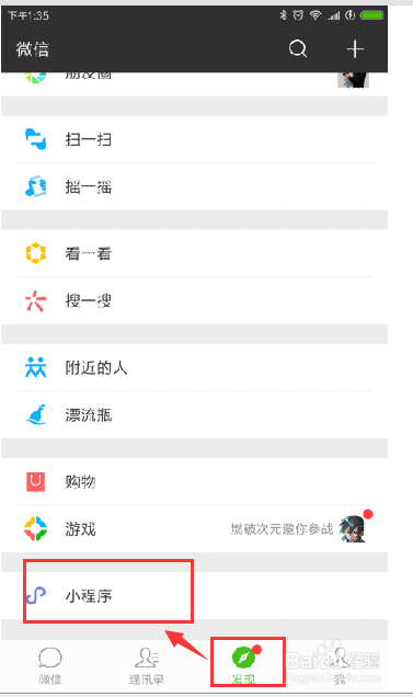 在打开的微信软件中,切换到“发现”界面,在发现界面的最下方找到小法式进口,点击小法式进入到微信小法式中。