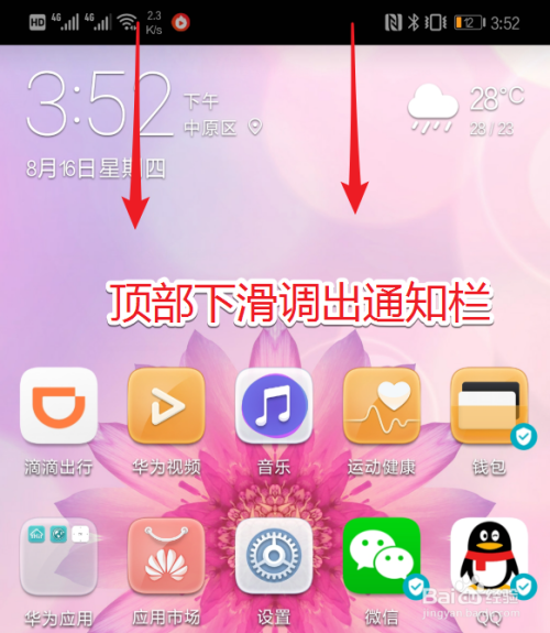 我们打开本身的荣耀play手机后进入本家儿界面,手指从最顶手下滑调出通知栏选项。