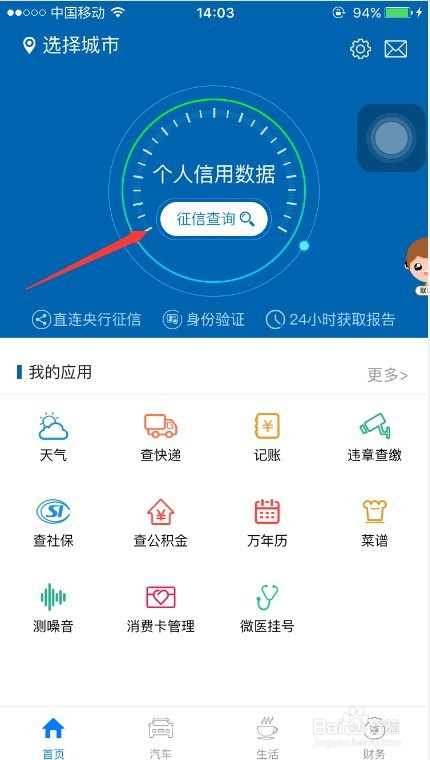 下载完当作之后,打开该app,进入查征信app的首页,可以看到征信查询的一个按钮,位置仍是比力较着的,点击该按钮,如图所示。