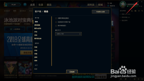 点击窗口右上角的齿轮(⚙)图标,即可进入游戏客户端的设置界面,默认为客户端/综合