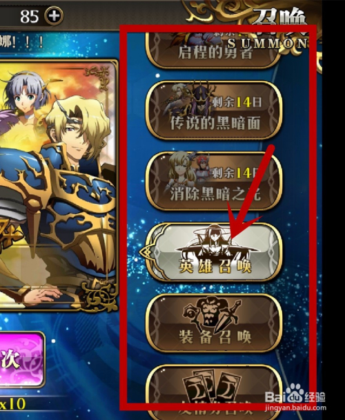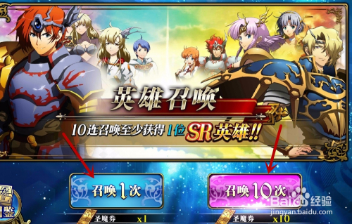 然后我们鄙人面点击呼唤按钮,可以呼唤1次或者10次连抽,我们10连抽更轻易获得SSR英雄,并且必得SR英雄,如图所示。
