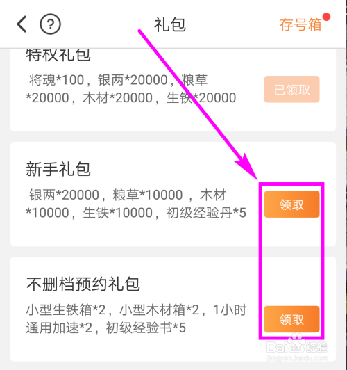 首先登岸你下载该游戏的平台,找到该游戏,在游戏介绍的下方找到礼包兑换,若是你达到了礼包兑换响应的前提,那么就点击响应礼包后面的【领取】。