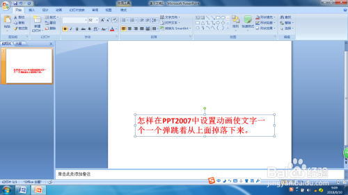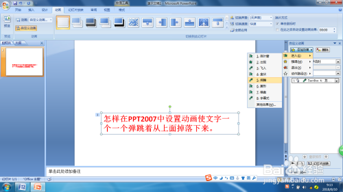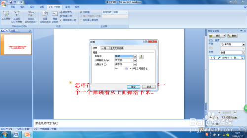 建造PPT时我们可以给幻灯片中的对象设置各类各样的自界说动画,如何设置让文字一个一个从上面失落落下来还弹跳几回呢?下面请分享一下我的经验。