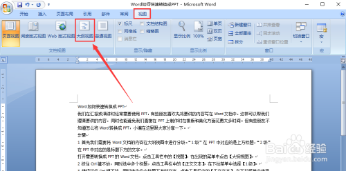 打开需要转换当作PPT的Word文档,点击东西栏中的【视图】,在呈现的菜单中点击【纲领视图】。