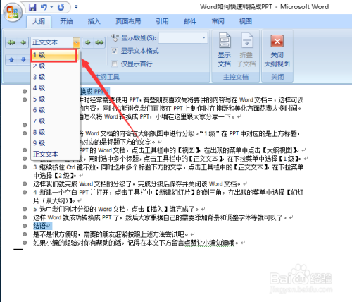 首先我们需要将Word文档的内容在纲领视图中进行分级。“1级”在PPT中对应的是上方题目,“2级”在PPT中对应的是题目下方的文字。