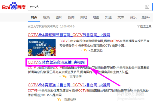 首先找到百度官网,在搜刮引擎中输入CCTV5,然后点击【百度一下】。