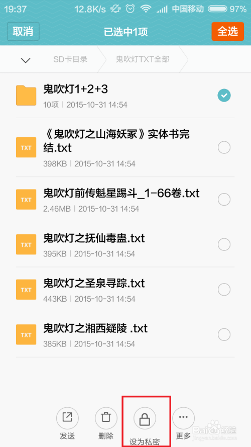 在弹出的菜单中,我们点击点击页面底端的“设为私密”按钮,在期待一会儿之后,页面就会弹出“设为私密当作功”的信息提醒,到此我们就当作功的将选中的文件设置为私密。