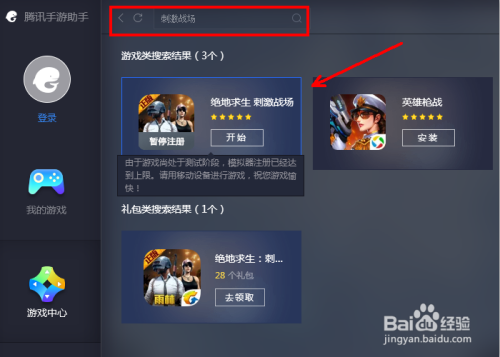 打开腾讯手游助手后搜刮刺激战场下载并安装,小编这里已经安装好了。