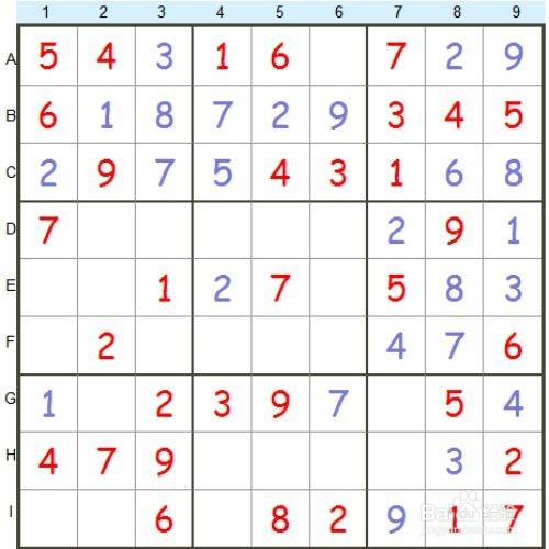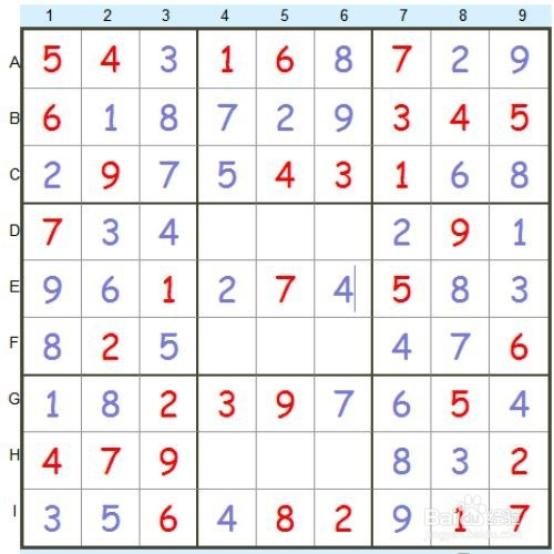 不雅察最右边一行,贫乏3和4,所以,{9,G}=4,进而,{9,E}=3。