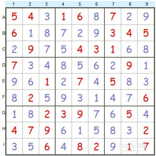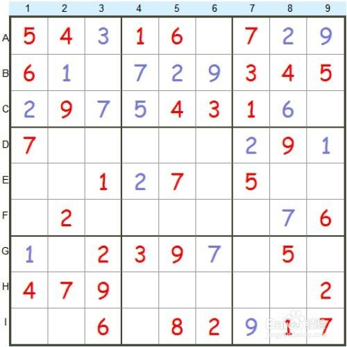同样的方式,可以知道{8,C}=6,{8,F}={6,G}={4,B}={3,C}=7,{7,I]={9,A}={6,B}=9,……待得所有的数字都试一遍之后,获得下面的状况。