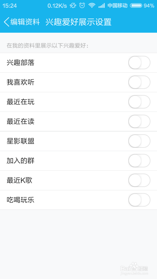 接下来,我们会看到默认的乐趣快乐喜爱设置中,所有的小我乐趣快乐喜爱开关都是开启的,所觉得了不让老友知道你的乐趣,可以将其全数封闭,如下图所示。