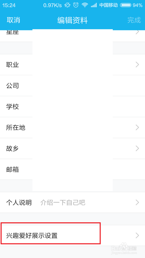 接下来,我们将进入小我资料编纂页面,在编纂页面中直接选择页面最底端按钮“乐趣快乐喜爱展示设置”。