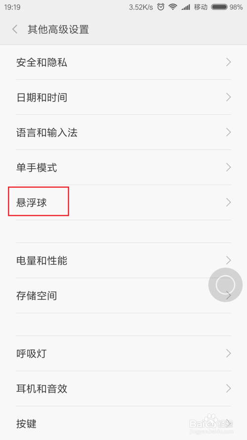 进入系统高级设置页面之后,我们可以看到“悬浮球”的设置选项,点击即可打开悬浮球设置页面。