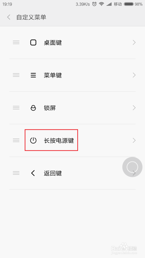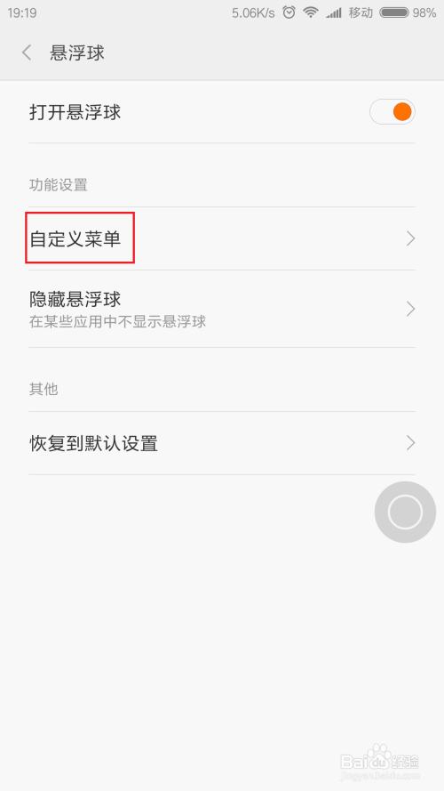 打开悬浮球设置页面之后,我们可以看到“自界说菜单”选项,点击并进入该选项设置页面。