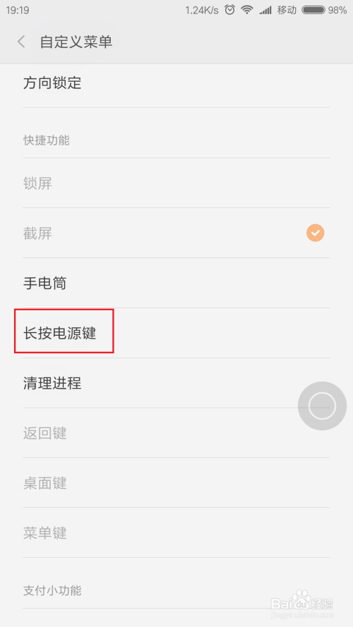 在待选功能页面中,我们点击选择“长按电源键”选项,点击之后即可将既有的截屏功能切换为长按电源键的功能。