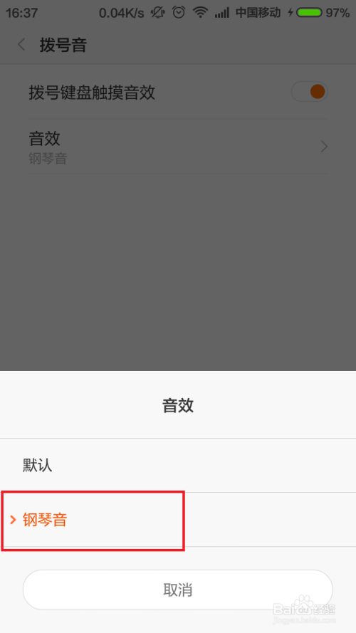接下来,我们需要点击“音效”菜单按钮,起头选择拨号音效,在拨号音效中有两个选项供大师选择,有默认音效也有钢琴音效,这里我们选择“钢琴”音效。
