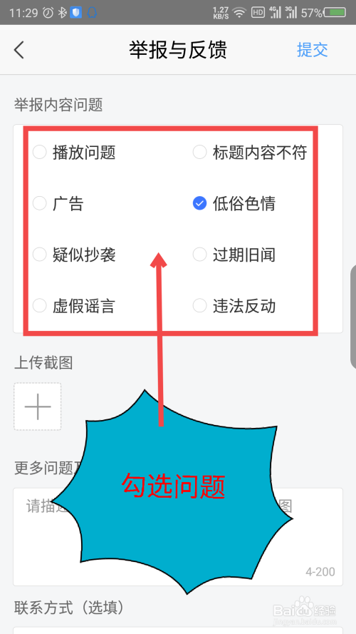 会打开举报与反馈界面,勾选举报内容问题。如图所示