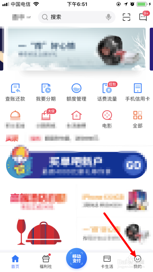 首先在手机上打开并登录买单吧App,并在首页面点击右下角的 我的 。