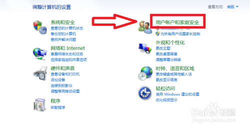 第三:打开节制面板之后,会看到如下页面。在右边那一列图标的最上方有一行“用户账户和家庭平安”,旁边有一对小人。密码设置功能就在这里。点击进入。