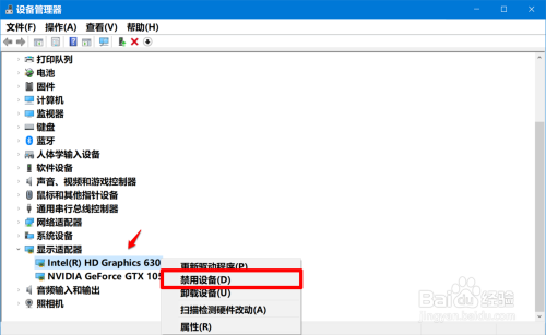 在睁开的 显示适配器 项下,我们右键点击:Intel(R) HD Graphics 630(集当作显卡),在右键菜单中点击:禁用设备(D);