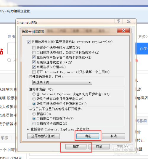 在设置页面中,找到“碰到弹出窗口时”设置项,点击“始终在新选项卡中打开弹出窗口”按钮,点击“确定”按钮,保留Internet选项设置。
