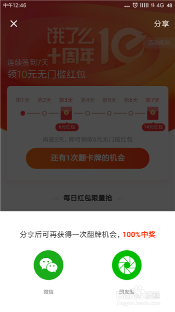 除了天天签到获得一次翻牌抽奖的机遇以外,每次分享给老友也可以获得额外的翻盘机遇。