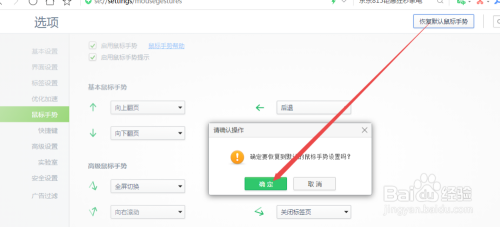 想要恢复默认鼠标手势,点击当前页面右上角的 恢复默认鼠标手势 按钮;然后在弹出的窗口中点击 确定 ,如许就恢复当作功了。