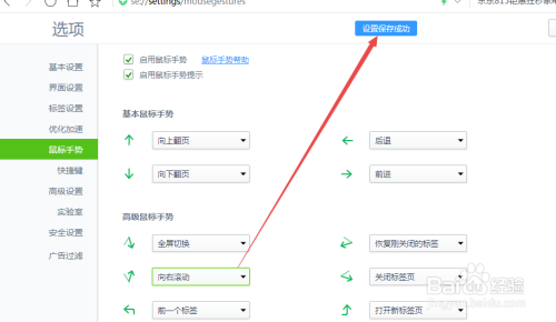然后在打开的页面中可以看到一些常用的鼠标手势以及高级的鼠标手势;可以按照现实需要来设置的,设置好之后,它会主动保留。
