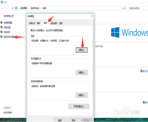 选择高级系统设置,选择高级,点击机能栏的设置。