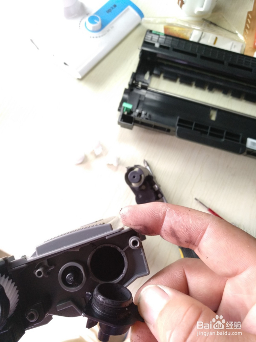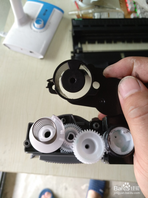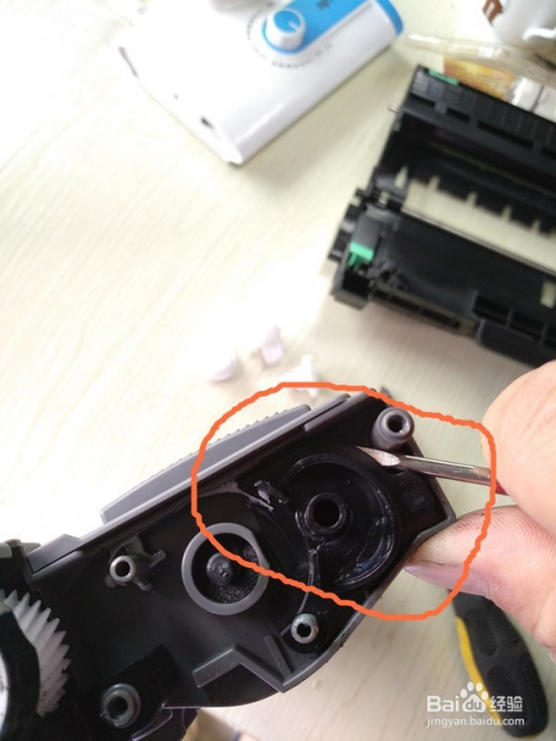 把图上红圈的两个螺丝拆下来,打开盖子,把齿轮都拿下来,呈现黑色的盖子,这就是粉盒的加粉孔,用一字螺丝刀撬开(注重:别撬坏了,加过粉之后还要用)。