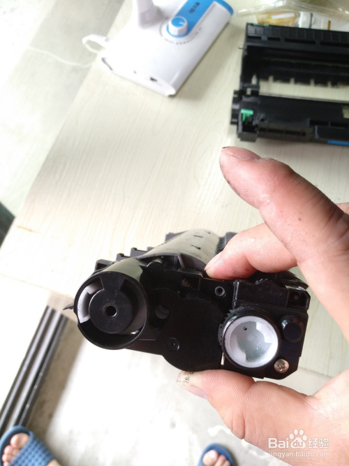 联想7400pro打印机硒鼓抽出来,把打印机硒鼓跟粉盒分手,我们只用在粉盒里面加粉,调节齿轮,就可以达到打印机清零了,我们粉盒型号:联想LT2451H。
