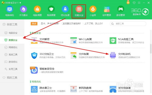 打开功能年夜全后找到“数据平安”,然后打开“文件破坏机”