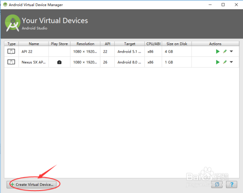 点击左下方的“Create Virtual Device”,如下图所示: